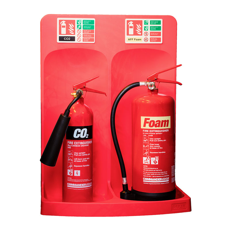 The Economy Double Fire Extinguisher Stand is made to be robust and is ideal for storing 2kg Co2 extinguishers together with any other extinguisher up to 9kg/9l.