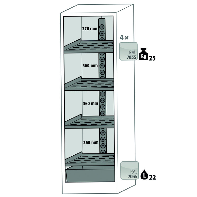- 4 Perforated shelves with 25kg load capacity