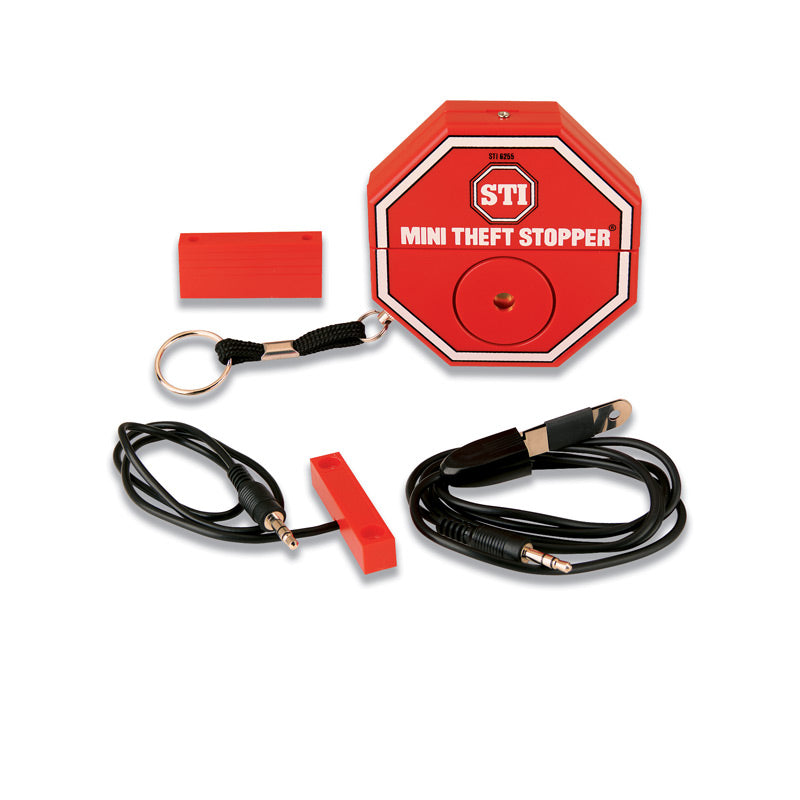 The Mini Theft Stopper comes with a special clip that can be used in several ways. An extinguisher's pull pin may be routed through the holes in both prongs of the clip. The clip is then held in place by the extinguisher's seal and when the seal is broken to use the extinguisher, the alarm sounds. The steel clip can also be placed under any type of equipment. When lifted, the alarm sounds immediately.