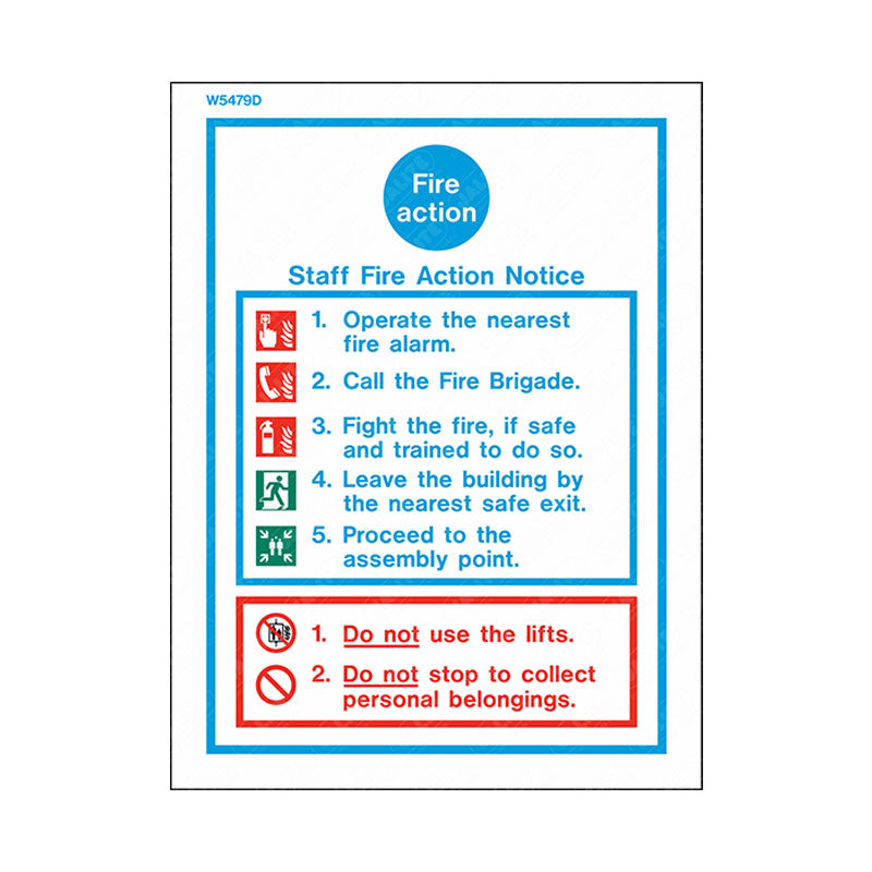 When positioned in conspicuous locations, the fire action notice sign provides a constant reminder to staff of the procedures to follow in an emergency evacuation situation.
