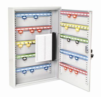 The Sterling single door heavy duty Key cabinets are designed for use in key management, security and access control systems within medium sized organisations. Having a capacity of up to 150 key stations with adjustable colour coded key hook rails for simple organisation and identification. Supplied complete with blank key tags.